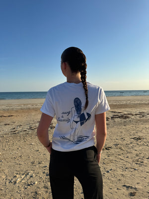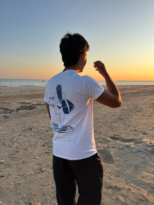 Ce tee-shirt célèbre celles et ceux qui attendent la dernière vague, les pieds dans l’eau, les yeux tournés vers l’horizon.